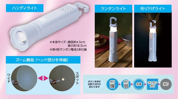 <プレゼントのお受け取り方法>本年度のお誕生日プレゼントは、お客さまのライフスタイルやさまざまなシーンに合わせてご使用いただける『カラビナ&蓄光テープ付きマルチライト』をご用意いたしました。ヘッド部分を伸縮させることでスポットからワイドまで点灯でき、本体を伸ばせばランタンとしてもご使用いただけます。また防災用の備えとしてもお役立ていただける商品です。